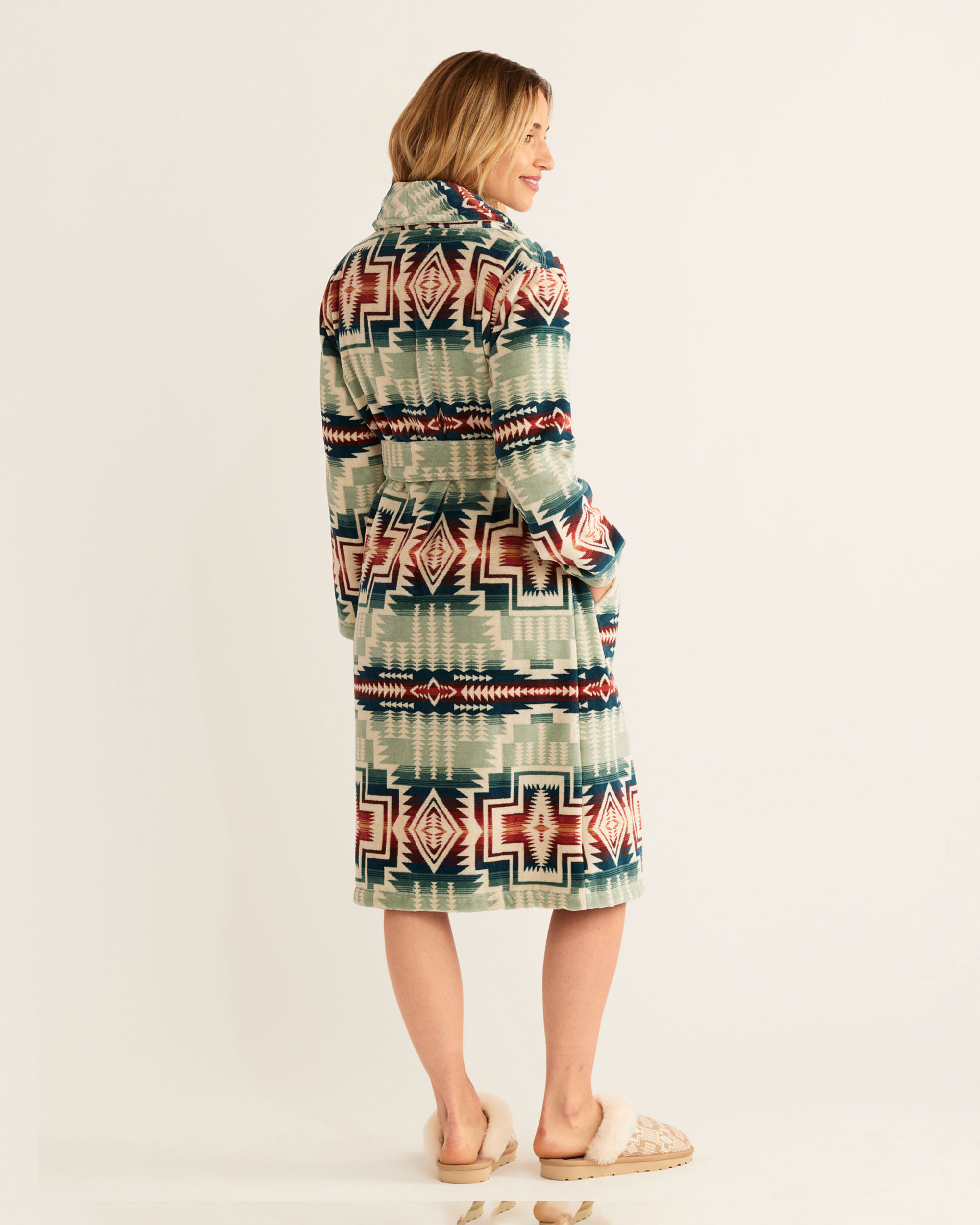A women��s version of our popular unisex pure-cotton wrap robe. Plush and velvety soft outside, with absorbent loops inside. Features our Harding pattern in Silver Blue. Shawl collar, two deep pockets and a self-fabric waist tie.