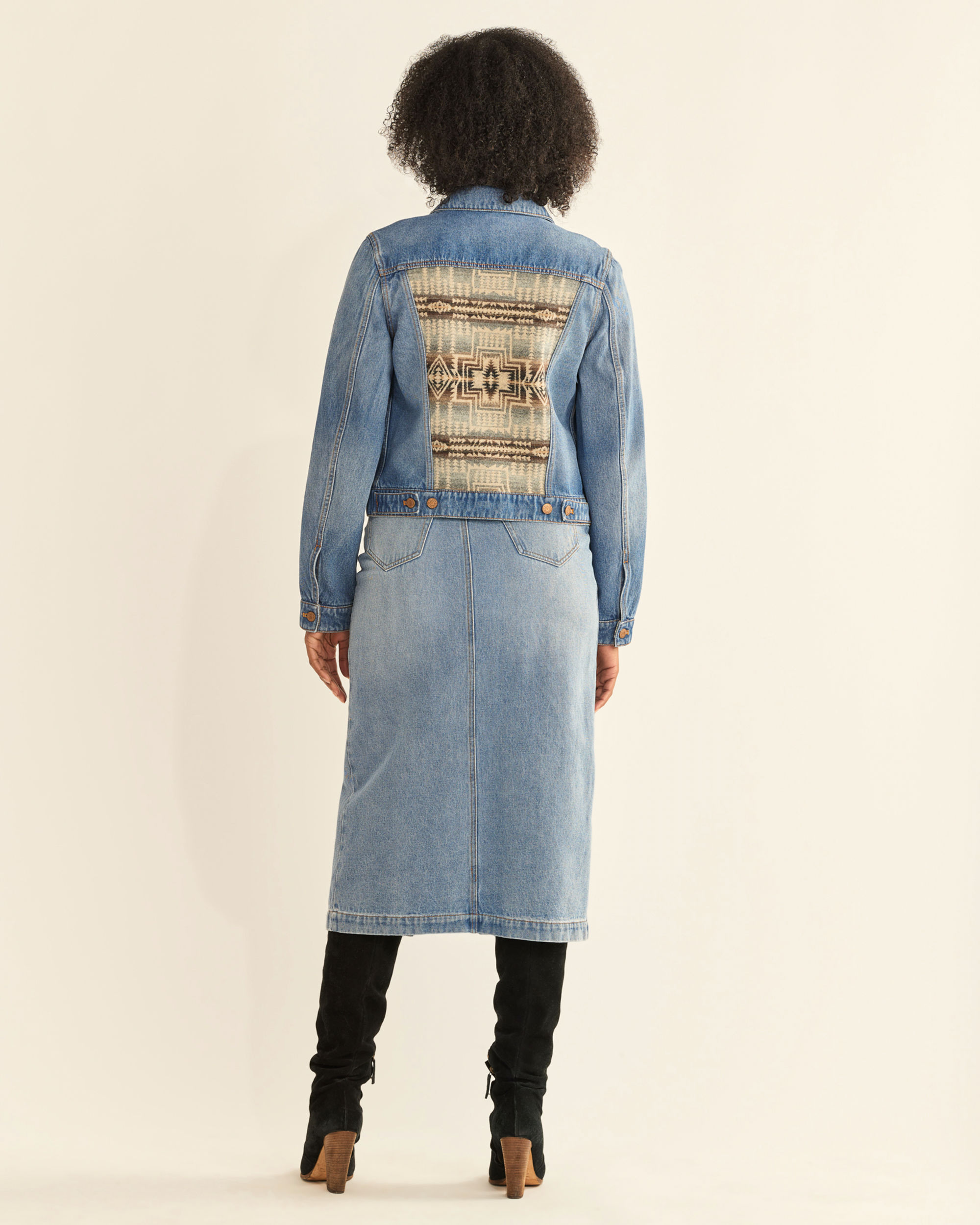 This classic, semi-fitted jean jacket has a uniquely Pendleton touch: back panel, pocket flaps and inner cuffs feature our USA-woven wool jacquard fabric in our 1923 Harding pattern. Metal buttons. Two chest pockets and two side-entry pockets.