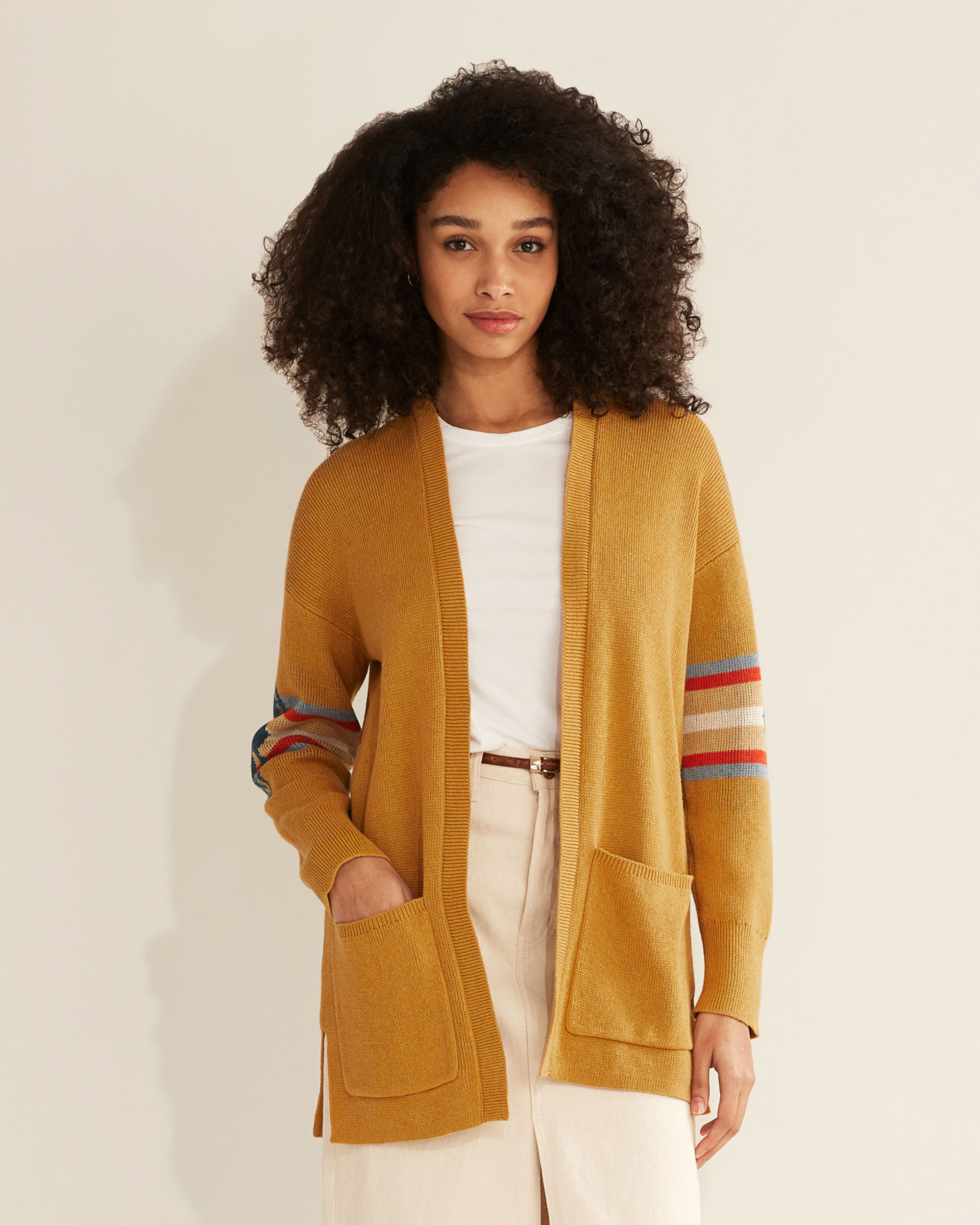 Women��s open-front cardigan sweater in a smooth birdseye knit, accented with our exclusive Harding pattern on back. Made from 100% cotton for breathability and year-round wear. Featuring a slightly oversized fit, with dropped shoulders, patch pockets and rib-knit trim. Long sleeves.